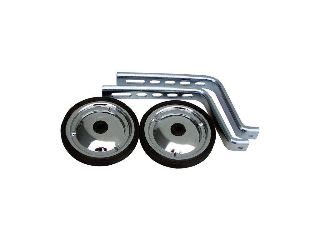 Pomocné kolieska pre začínajúcich cyklistov. Gumené kolieska s oceľovým stredom majú dlhú životnosť a mäkký chod. Pevný úchyt z oceľového profilu hrúbky 3 mm a bezpečnostnými ramenami a podložkami držia kolieska pevne na svojom mieste aj pri nabehnutí na prekážku. Oceľový profil s otvormi umožňuje nastaviť kolieska pre bicykle s 12-20" kolesami.