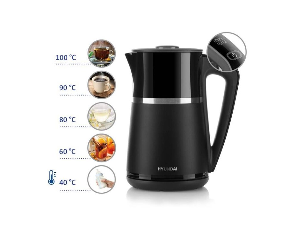 Dizajnová kanvica Hyundai VK309 s príkonom 2 200 W je nielen krásna, ale aj praktická. Umožní vám nastaviť si presne takú teplotu, akú práve potrebujete. Celkom môžete vyberať z 5 možností nastavenia teploty (40 °C, 60 °C, 80 °C, 90 °C a 100 °C). Po dosiahnutí požadovanej teploty kanvica cinkne a automaticky sa vypne.